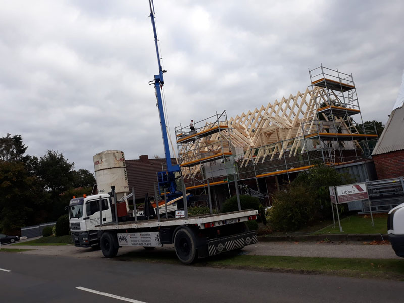 beendet und arbeitet seitdem als Geselle. Seit 2002 hat das Unternehmen eine Gewerbehalle in Ostrhauderfehn, Sandkamp 9 a, da der Platz beim Privathaus an der Kirchstraße nicht mehr ausreichte. „Am Standort im Gewerbegebiet sind wir flexibler, denn wir haben hier die Möglichkeit, den Abbund zu fertigen“, berichtet Werner Haak. Auch gibt es hier genügend Unter- und Abstellmöglichkeiten für die Geräte und den Fuhrpark, zu dem drei Fahrzeuge, zwei Anhänger und ein Kran gehören. Zum Jubiläum stellten die Mitarbeiter ihrem Chef eine große 25 aus Holz vor das Haus in der Kirchstraße 164 a. „Darüber haben meine Frau und ich uns sehr gefreut“, so Werner Haak.